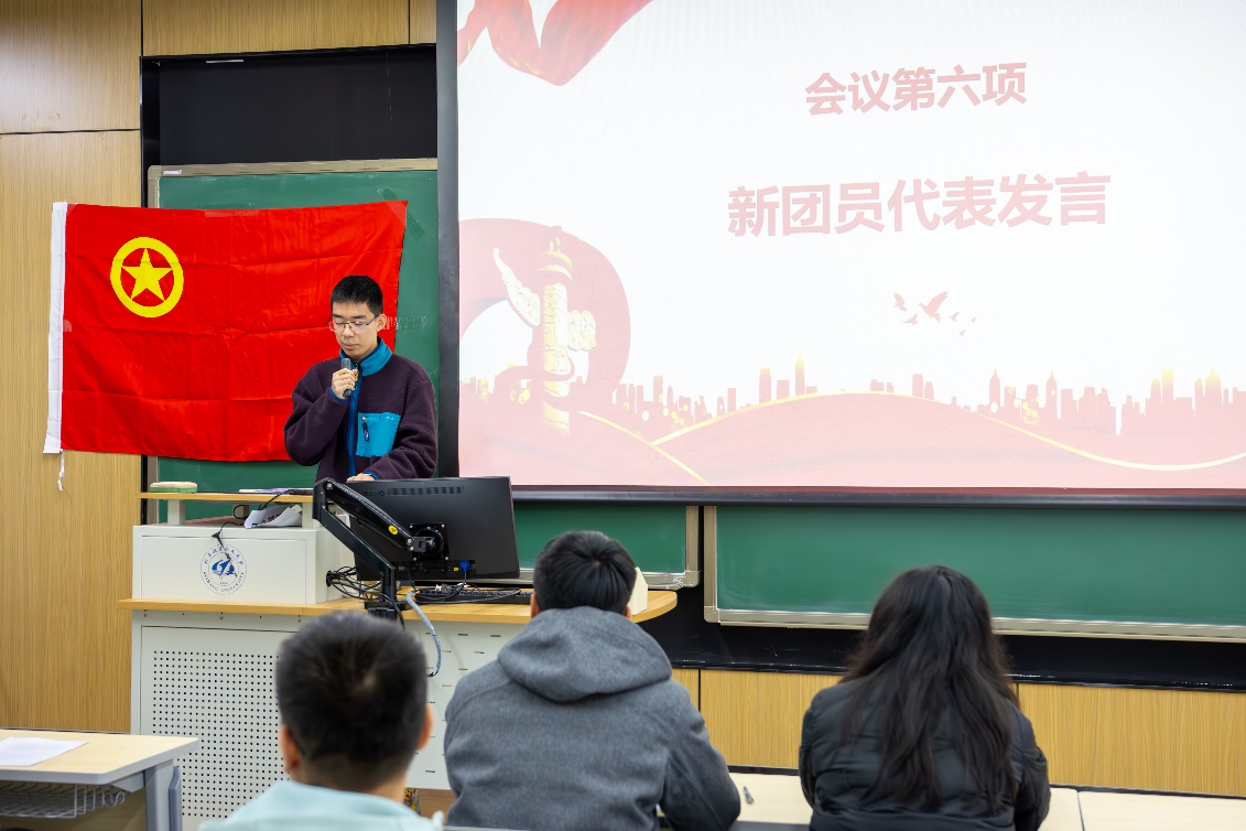 之后新团员代表侯懿同学发言,他表示加入共青团是自己的荣誉,并决心以坚定信念、扎实技能和创新精神,做新时代有理想、有担当的青年。