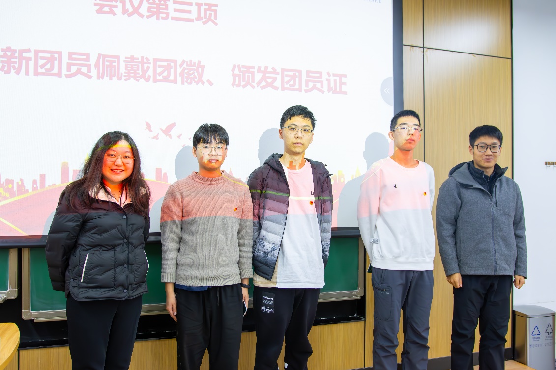 会议伊始,江津宣读了2024-2025学年秋季学期新发展团员名单。乔娇为新团员佩戴团徽,吕子良为新团员颁发团员证。