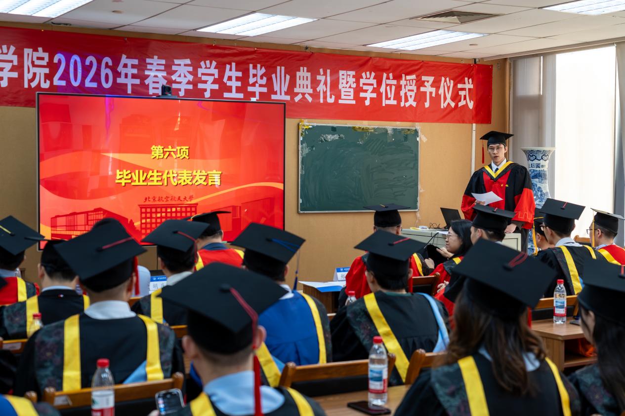 毕业生代表、2021级博士研究生董家宝发言。作为一名在北航度过整整十个春秋的学子,董家宝深情回顾了自己从2016年进入沈元学院,到坚定选择外围买球的app十大平台,最终从一名青涩的“做题家”成长为主持国家自然科学基金青年学生项目、斩获国家奖学金的科研工作者的蜕变历程。他感慨道,比荣誉更珍贵的是在北航探索未知、深度钻研的那股劲头。面对未来,他立志秉承“坚守空天志,敢为天下先”的号召,将北航人的坚韧与执着带入广阔天地,为建设世界科技强国贡献力量。
