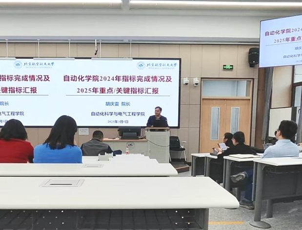 院长胡庆雷总结学院2024年指标完成情况,并对学院2025年工作重点及关键指标进行了详细部署及解读。2024年,学院在学科建设、师资队伍、科技创新、人才培养、国际合作、行政管理等方面均取得了丰硕成果,荣获学校2024年度机构考核优秀单位。他指出,要深刻学习领悟学校2025年“数智赋能年”的重要意义,拥抱数智赋能新趋势。他强调,在新的一年,希望全体教师勠力同心、勇毅前行,加快补齐短板弱项、稳步提升既有优势,全力以赴实现学院各项重点工作目标,以实干实效持续推进学院高质量发展。