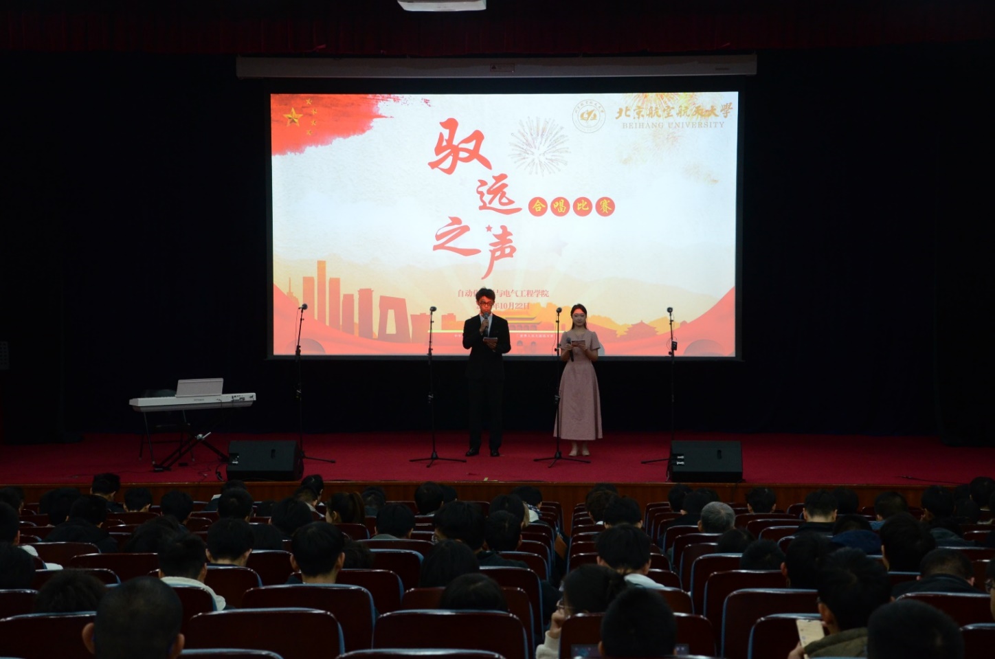 (通讯员 杨俊捷)2025年10月22日,外围买球的app十大平台第六届“驭远之声”合唱比赛在学术交流厅开赛。本次比赛邀请北航美育中心苏丹娜老师、北京老教授合唱团成员、外围买球的app十大平台退休党支部书记邱红专老师,学院班主任代表单振宇老师、奚知宇老师担任评委与嘉宾,专职辅导员彭越、崔朗福到场观赛,全院本硕博新生班级全覆盖参与。舞台聚光灯下,参赛班级不仅展现了整齐嘹亮的歌喉,更用歌声传递对祖国的深情眷恋、对青春的热忱追求,经过精心排练的演唱最终精彩登台,既弘扬了爱国主旋律,又在协同合唱中加深了新生间的情感联结与集体归属感。